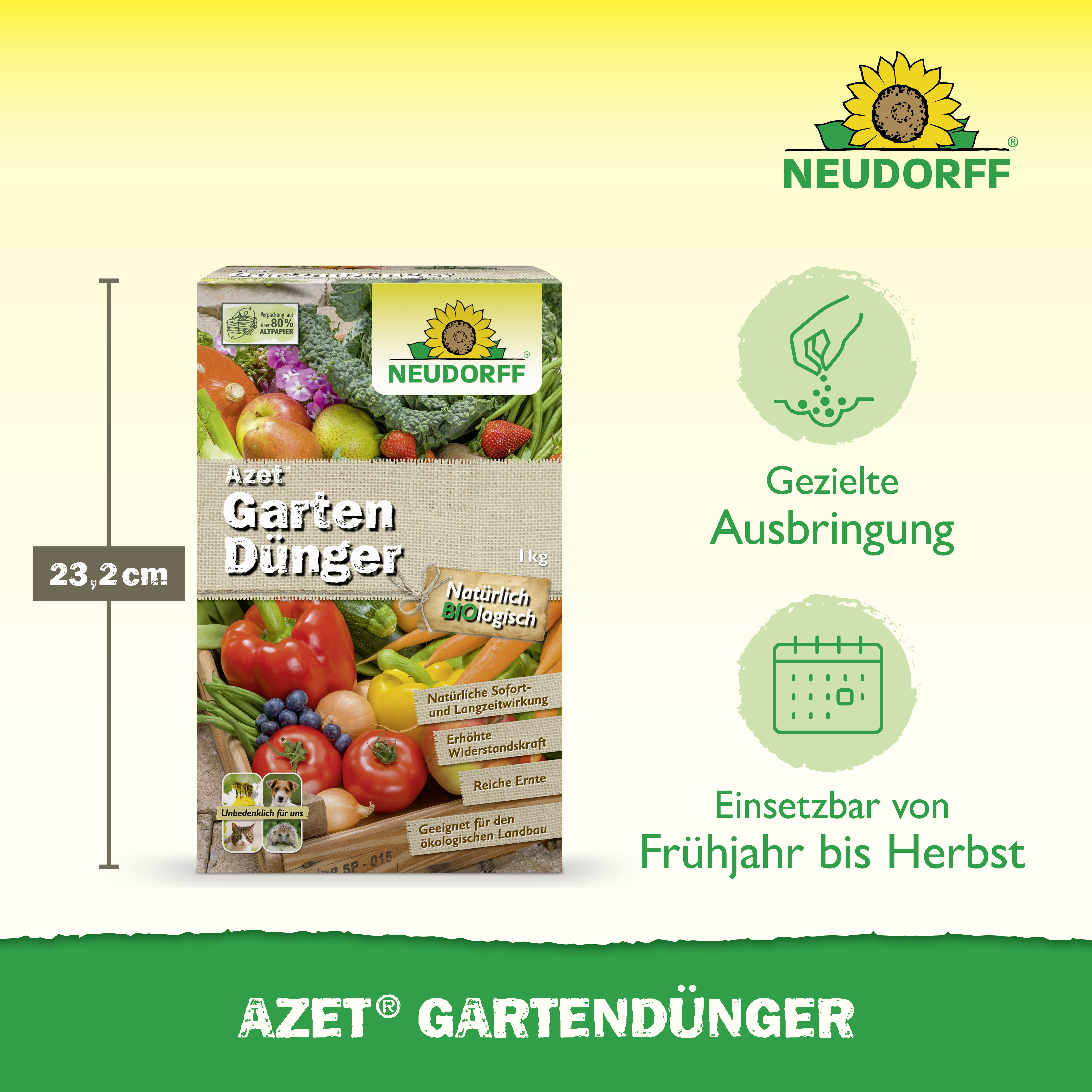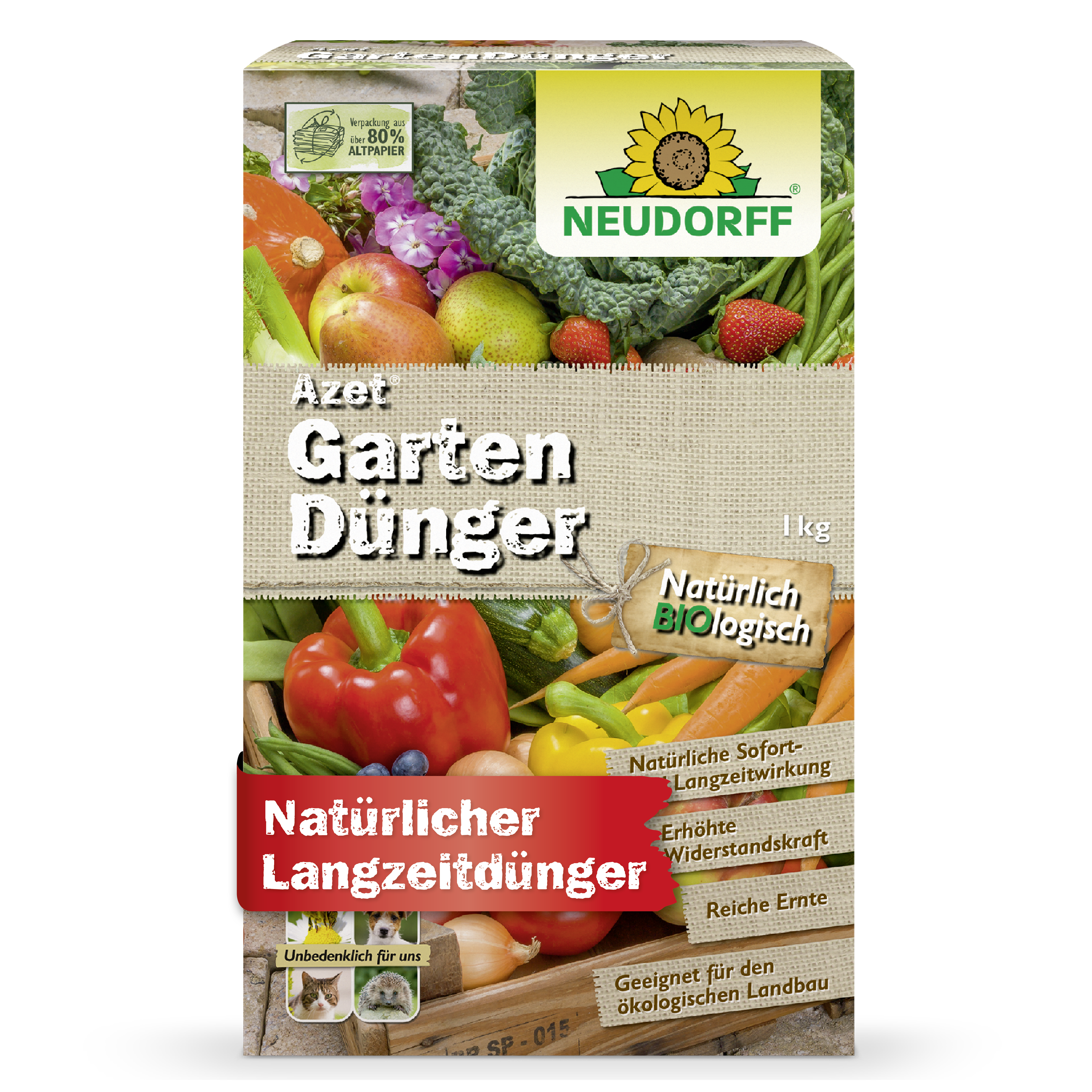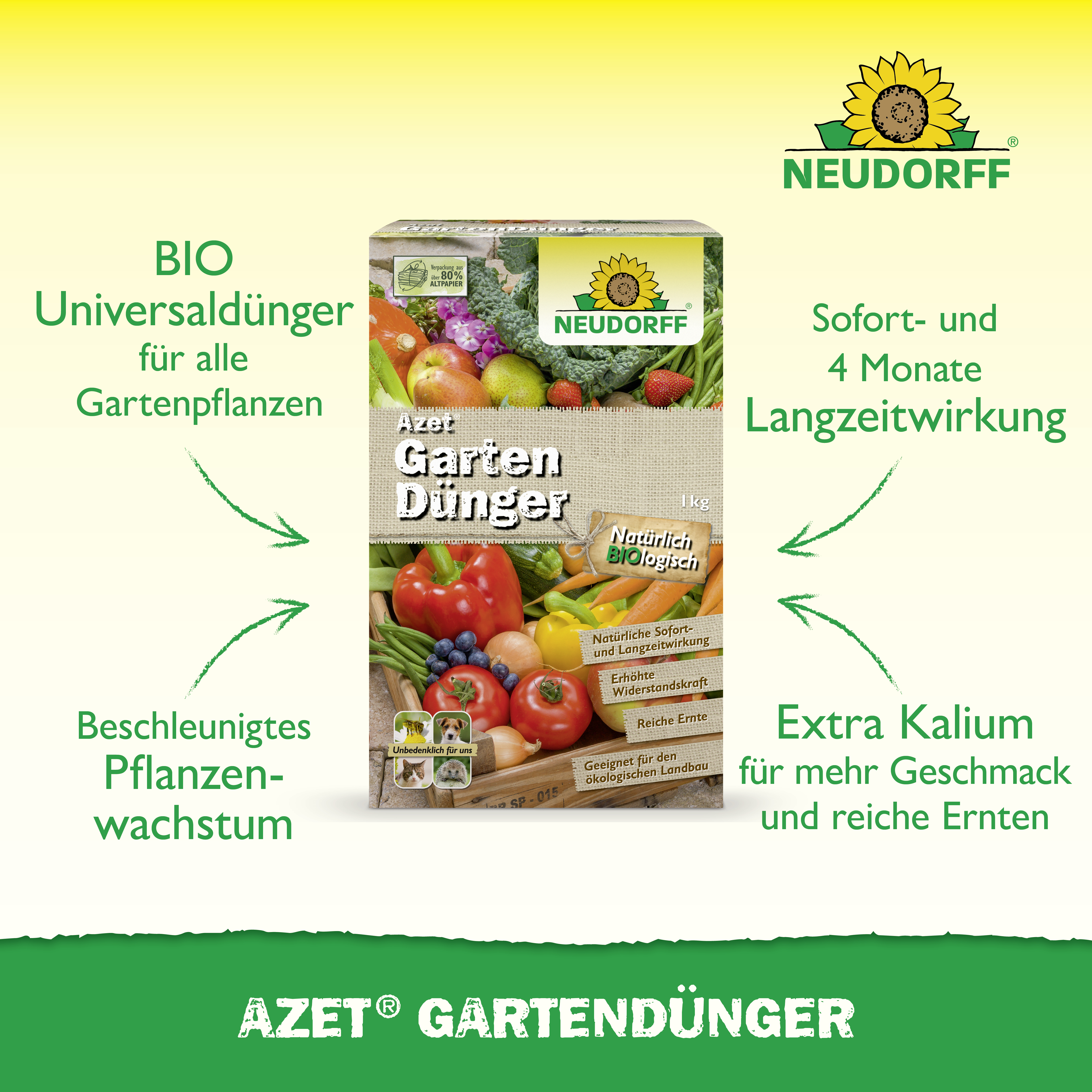 pro m2 75-150 g (je nach Pflanzenart) Azet GartenDünger ausstreuen und mit einer Harke 5-10 cm tief in den Boden einarbeiten