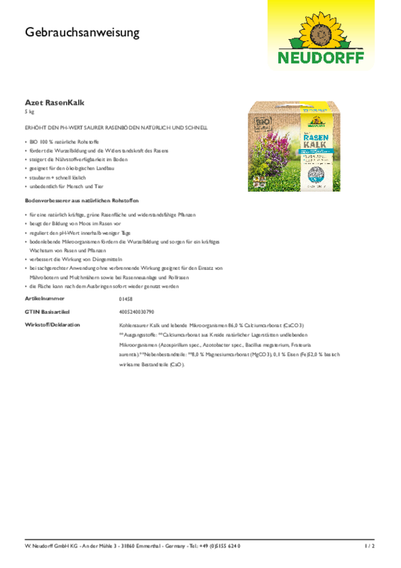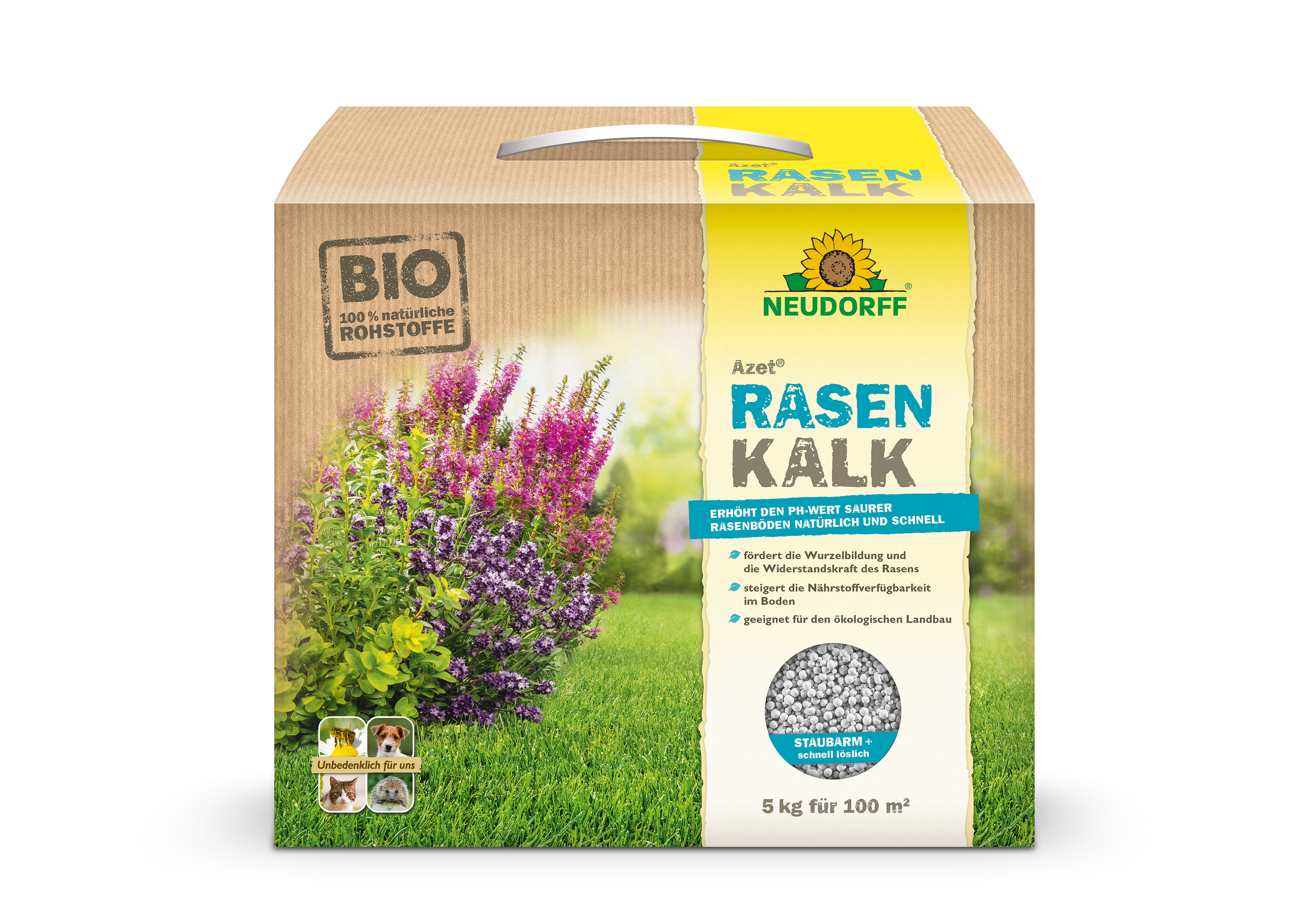 Als vorbereitende Maßnahme ermitteln Sie den pH-Wert des Bodens mit dem pH-Bodentest von Neudorff. Die Ausbringung von Azet RasenKalk ist ganzjährig möglich. Sie können ihn sowohl einzeln als auch zusammen mit Azet RasenDünger, Terra Preta BodenVerbesserer, Bentonit SandbodenVerbesserer oder Neudorffs UrgesteinsMehl ausbringen.