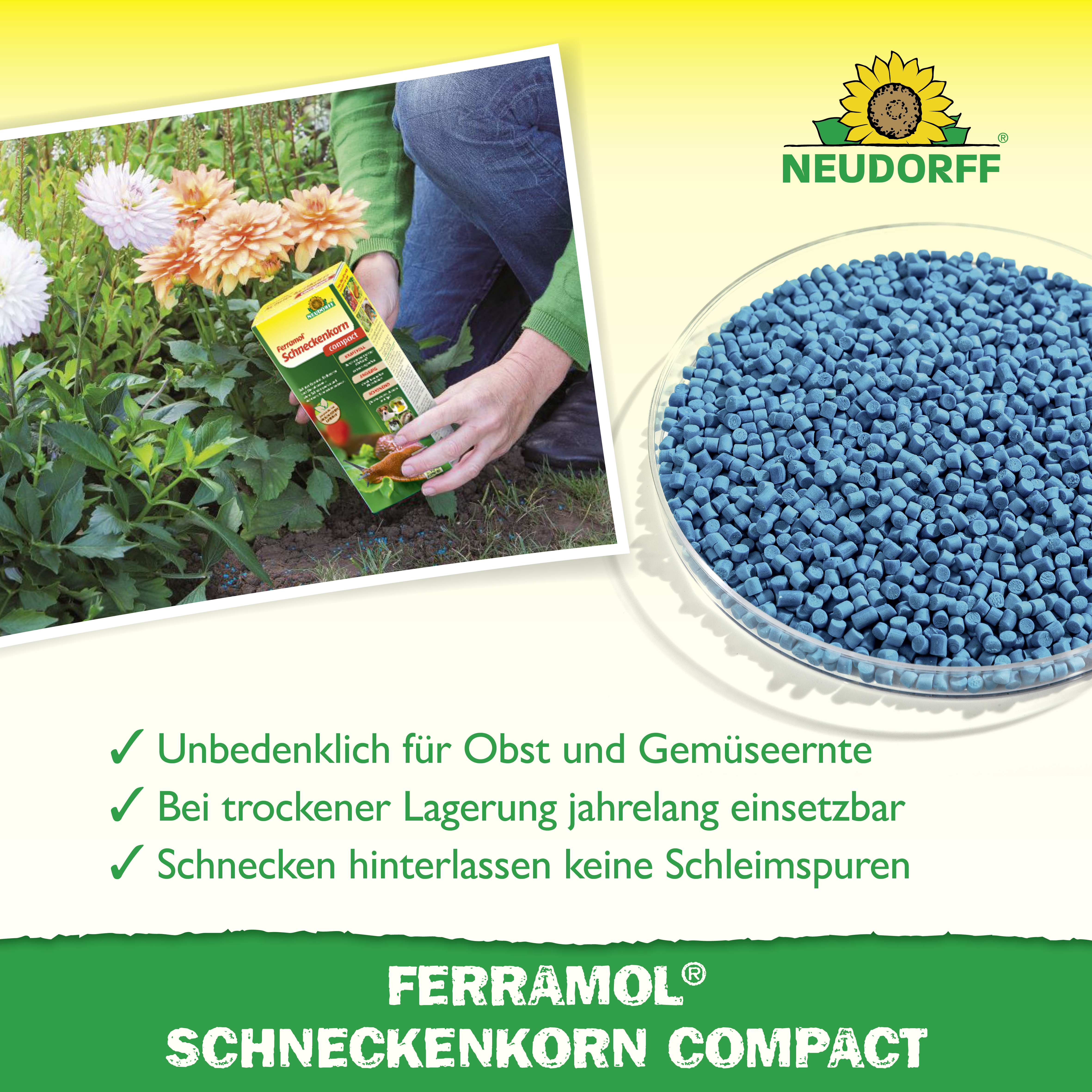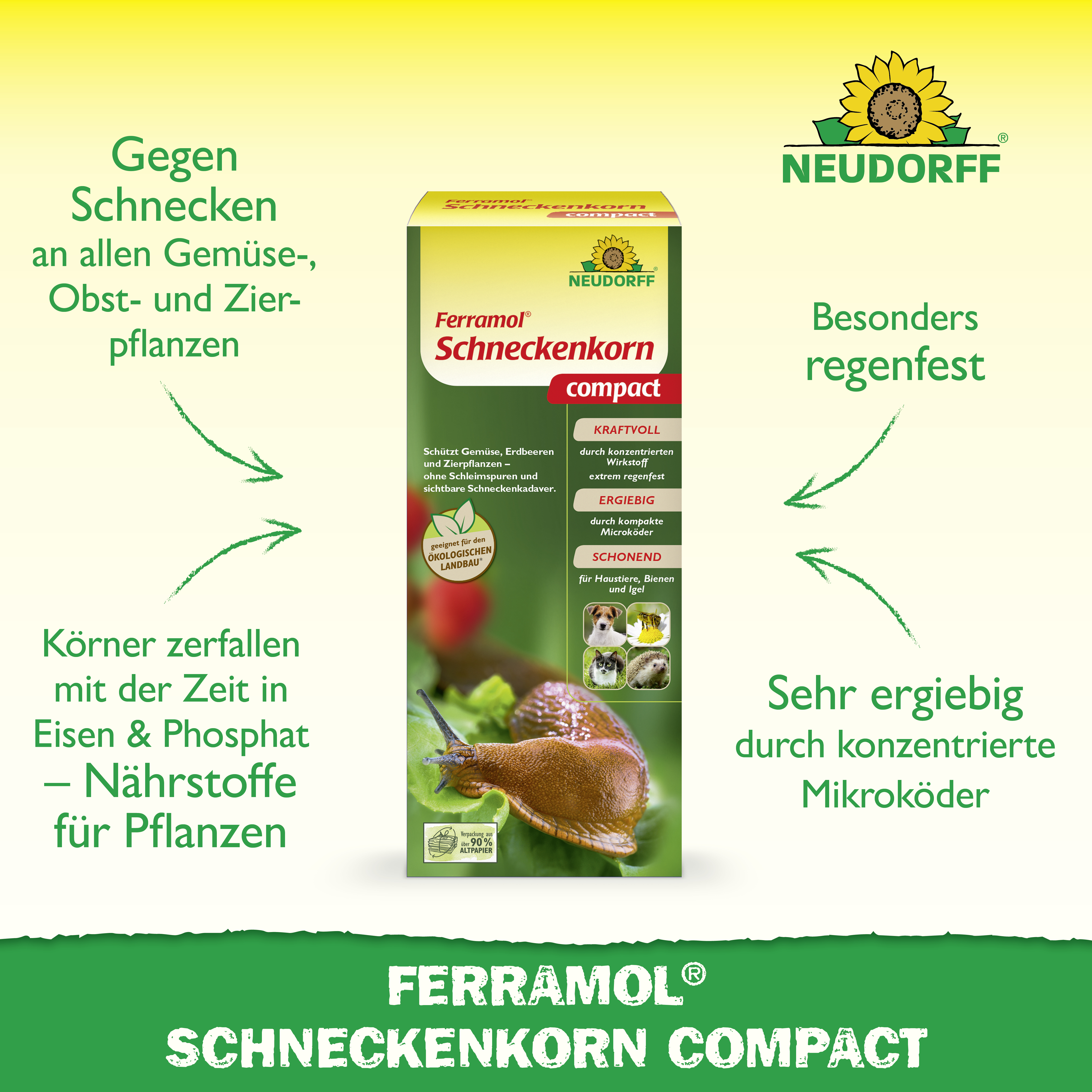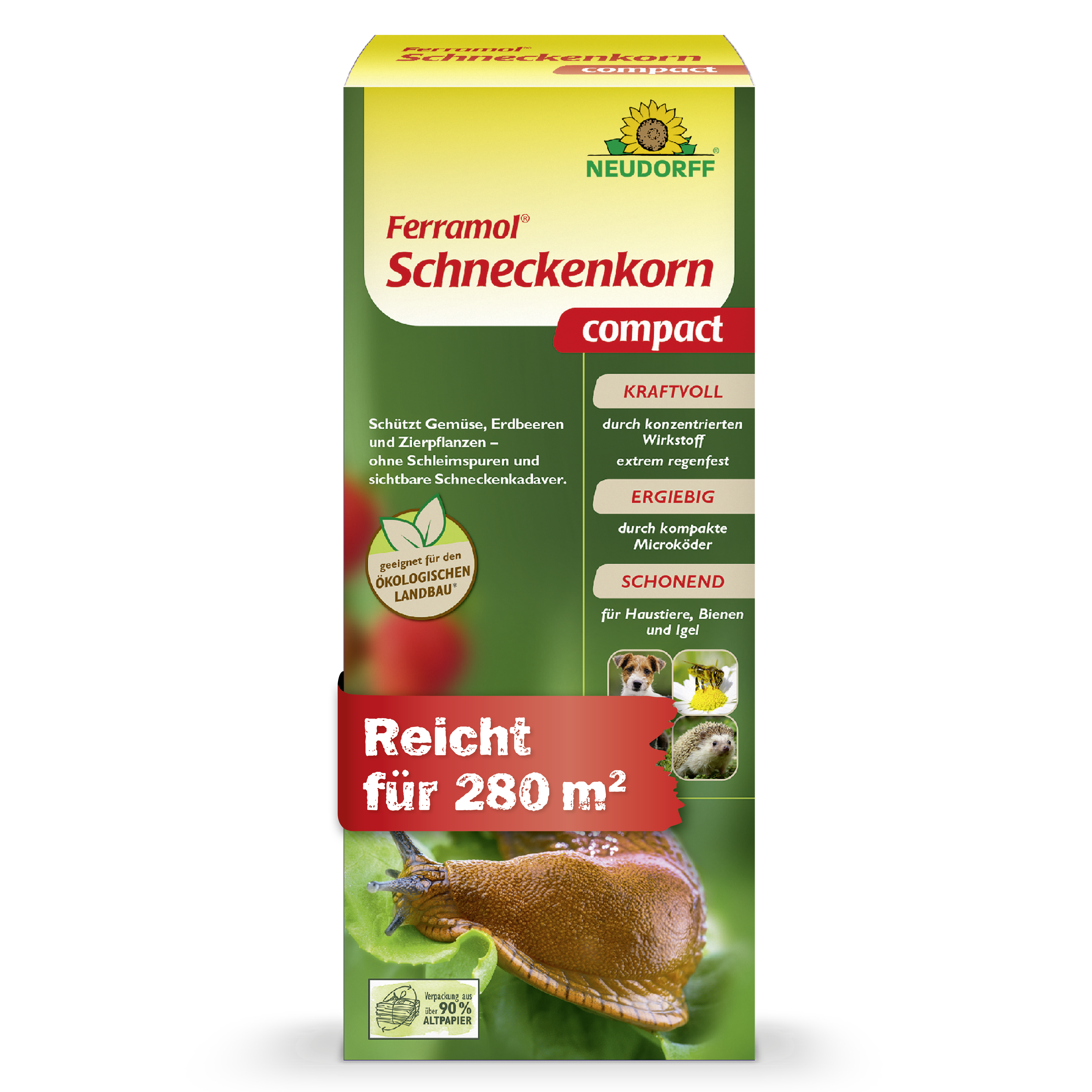Aufwandmenge 2,5 g/m² (= ein gestrichener Teelöffel). Ferramol Schneckenkorn compact* bei Befallsbeginn bzw. Sichtbarwerden der ersten Fraßschäden gleichmäßig zwischen die Kulturpflanzen streuen. Beete direkt nach der Pflanzung abstreuen. Bei starkem Befall auch angrenzende Beete, in die sich die Schnecken zurückziehen, mitbehandeln.Ferramol Schneckenkorn compact* nicht in Häufchen auslegen oder nur ringförmig um einige Pflanzen ausstreuen.
