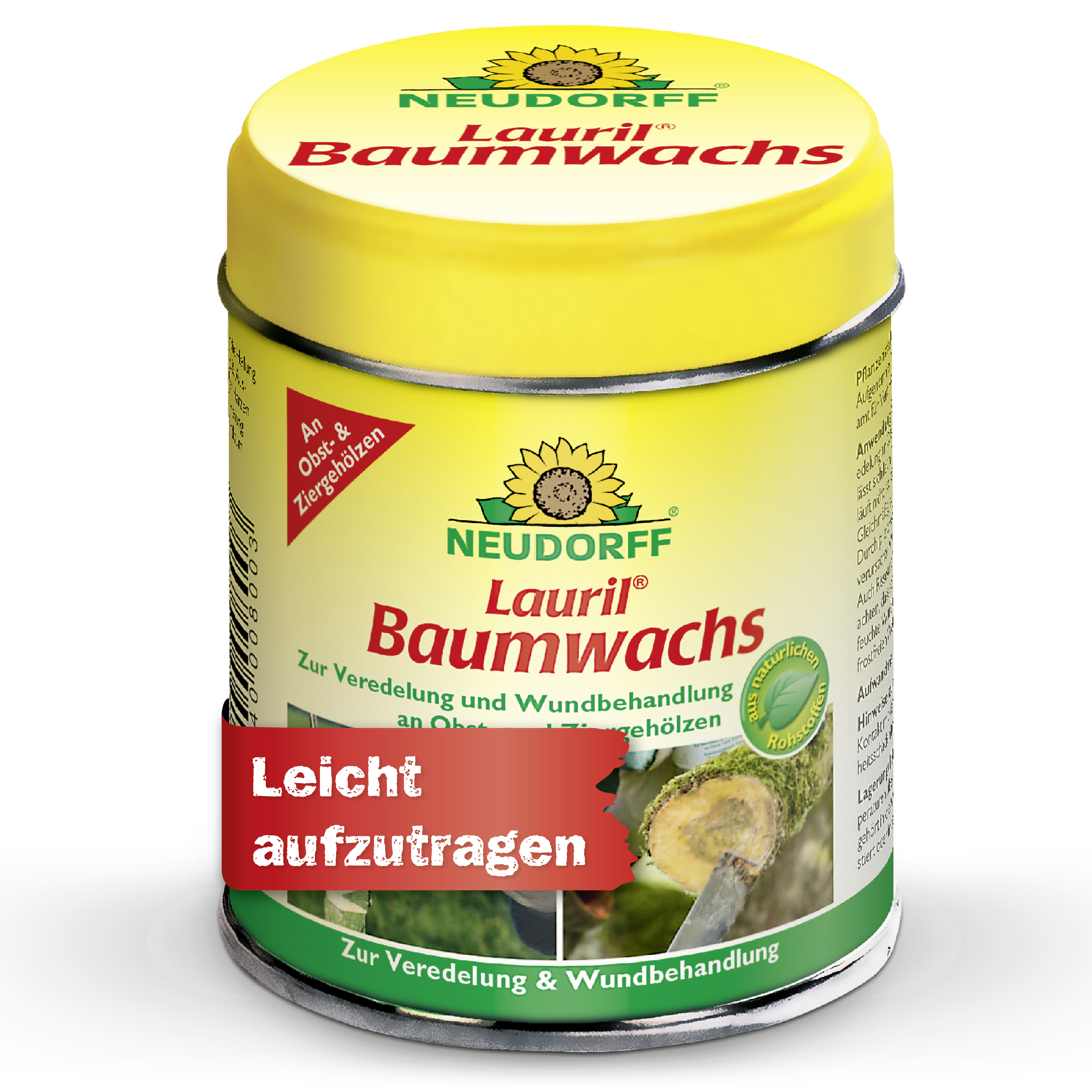 Zur Wundbehandlung, Wundverschluss und Veredelung an Obst- und Ziergehölzen im Freiland. Lauril Baumwachs lässt sich leicht mit einem Span, Spachtel oder harten Pinsel auftragen, läuft nicht ab, bleibt jahrelang geschmeidig und reißt nicht auf. Gleichmäßig auf durch Rückschnitt verursachte Wunden auftragen. Durch pilzliche Erreger wie Obstbaumkrebs oder Valsa-Krankheit verursachte Wunden vor der Versorgung gründlich ausschneiden. Auch Risse und Vertiefungen sorgfältig ausstreichen und dabei darauf achten, dass sich keine Hohlräume oder Luftblasen bilden. Nicht auf feuchte Wunden auftragen. Anwendung nur bei trockenem Wetter und frostfreien Wetter. Angetrocknetes Baumwachs wird durch Erwärmen wieder verstreichbar.