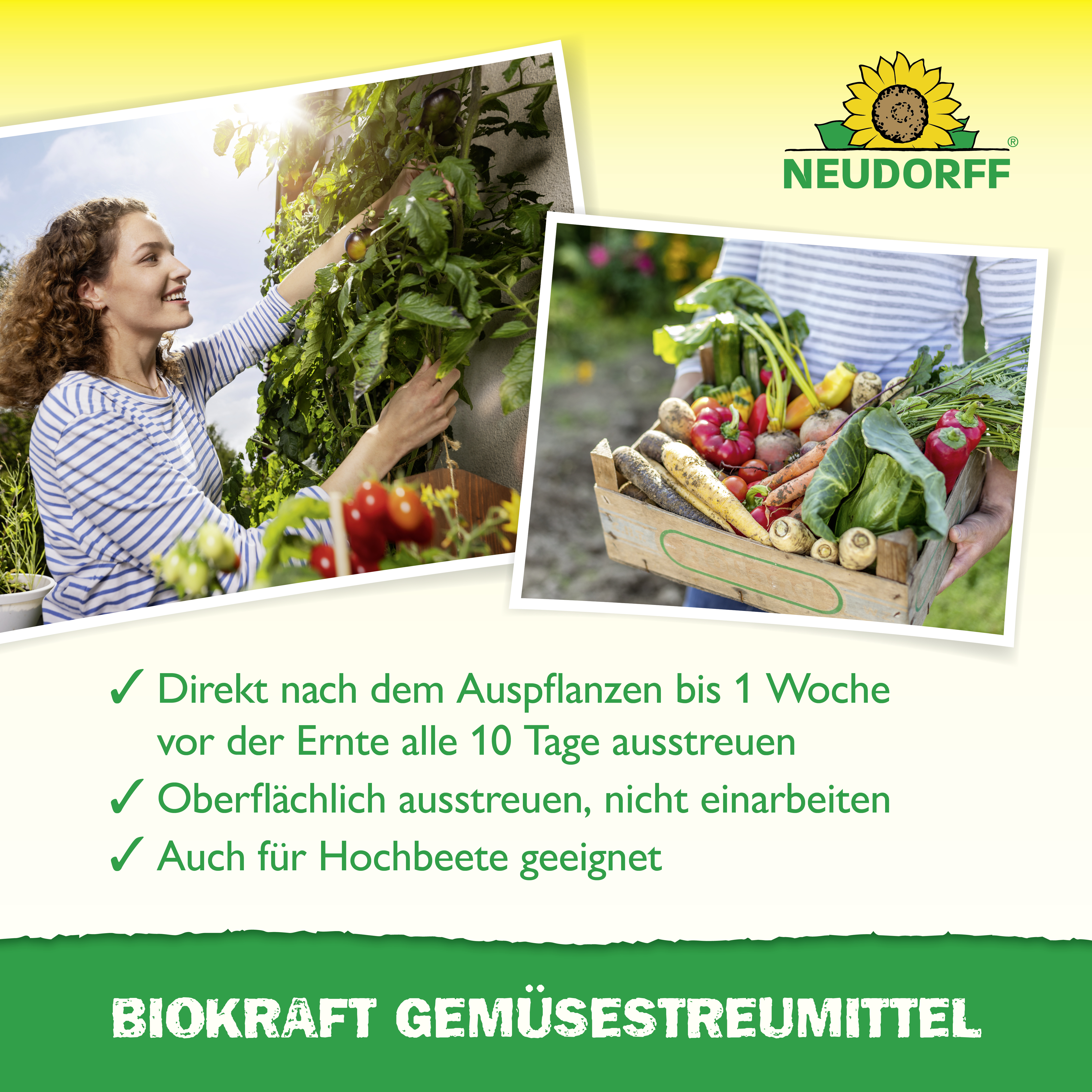• gleich nach dem Keimen bzw. Auspflanzen bis 1 Woche vor der Ernte alle 10 Tage ausstreuen