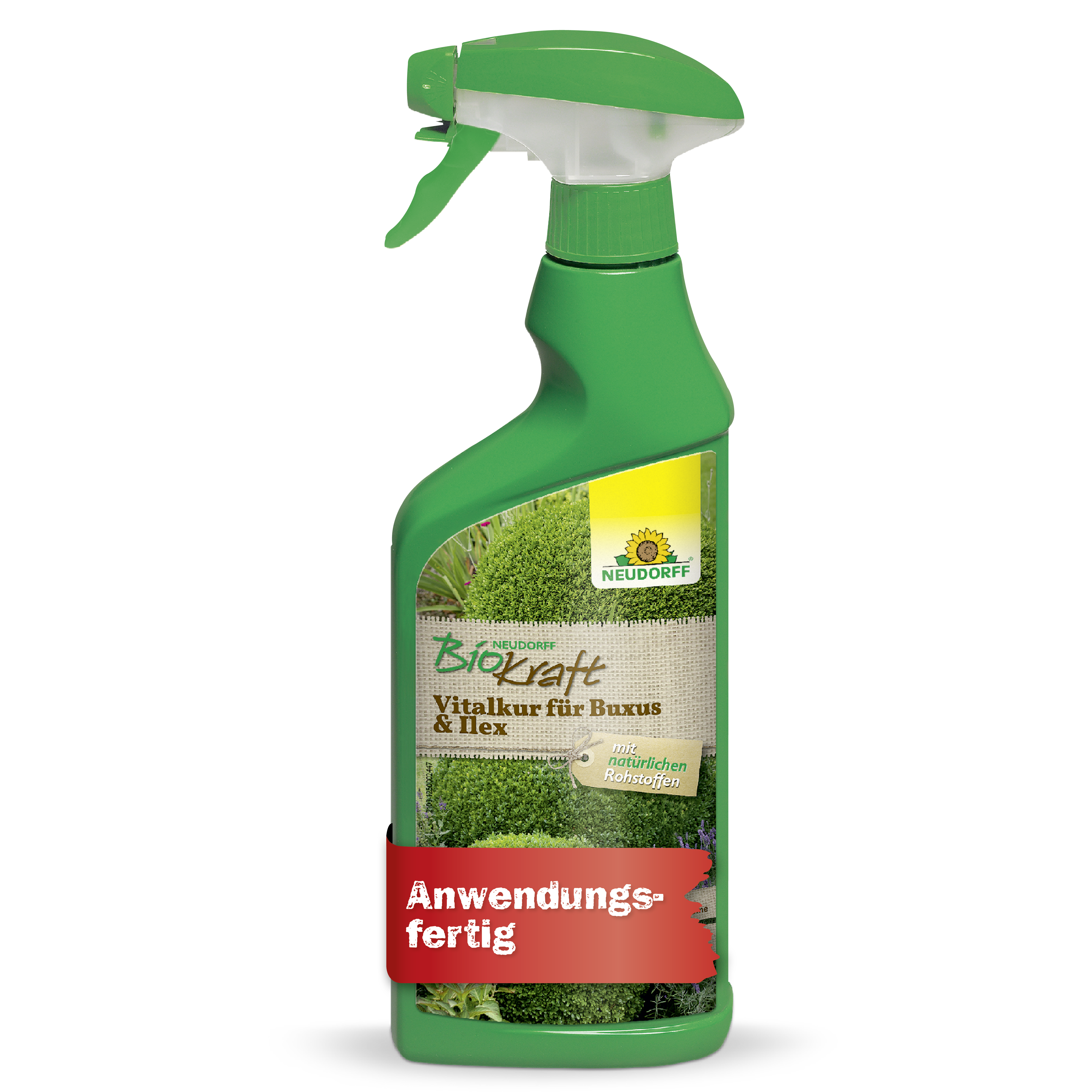 Neudorff BioKraft Vitalkur für Buxus & Ilex ist anwendungsfertig. Alle Pflanzenteile gründlich tropfnass benetzen. Bei Sonneneinstrahlung können Schäden an den Kulturpflanzen auftreten. Deshalb die Pflanzen bei und nach der Behandlung nicht der prallen Sonne aussetzen. Anwendung ab Vegetationsbeginn, alle 7-10 Tage spritzen.
