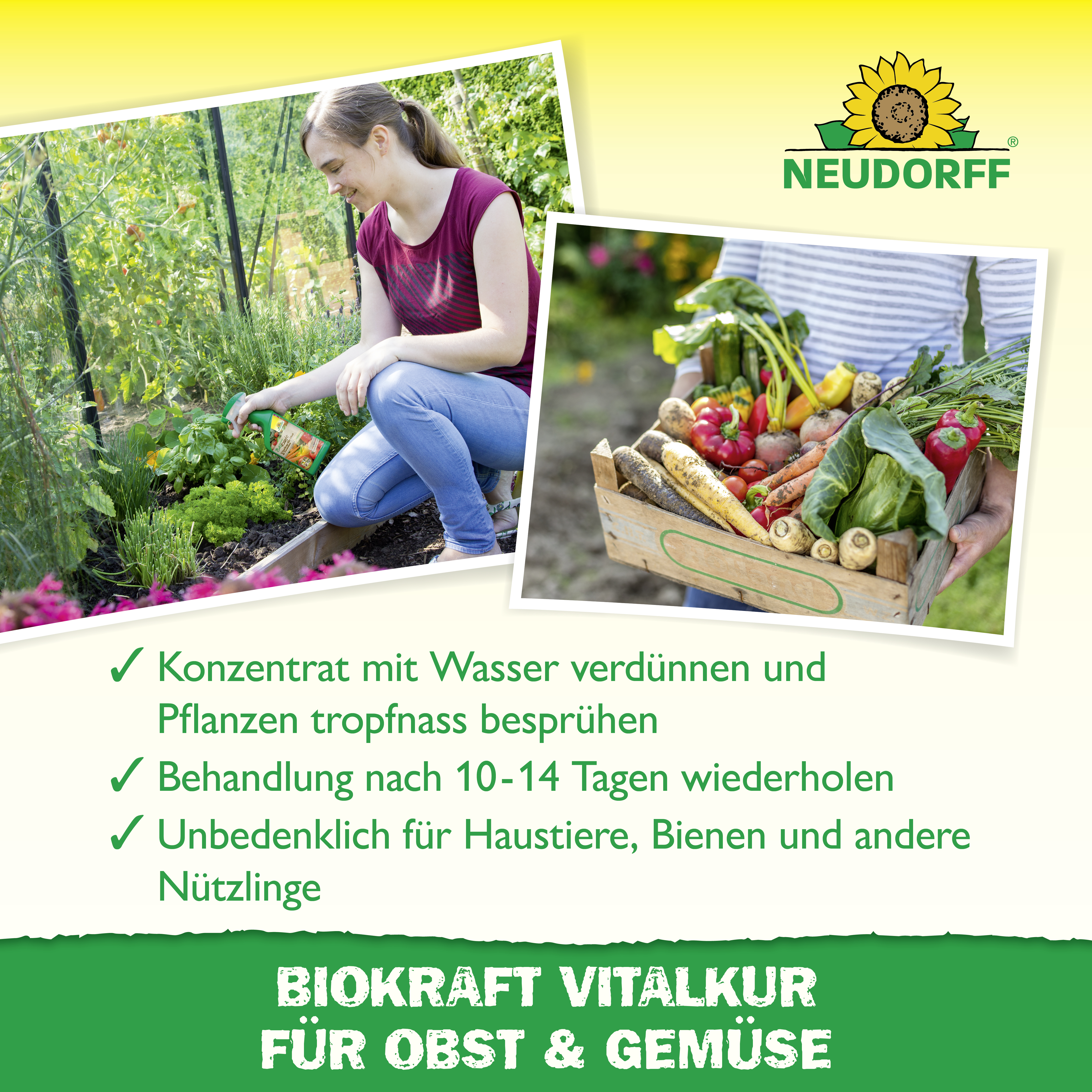 Nach dem Anwachsen alle 10-14 Tage mit Neudorff BioKraft Vitalkur für Obst & Gemüse gründlich nassspritzen oder regelmäßig gießen.