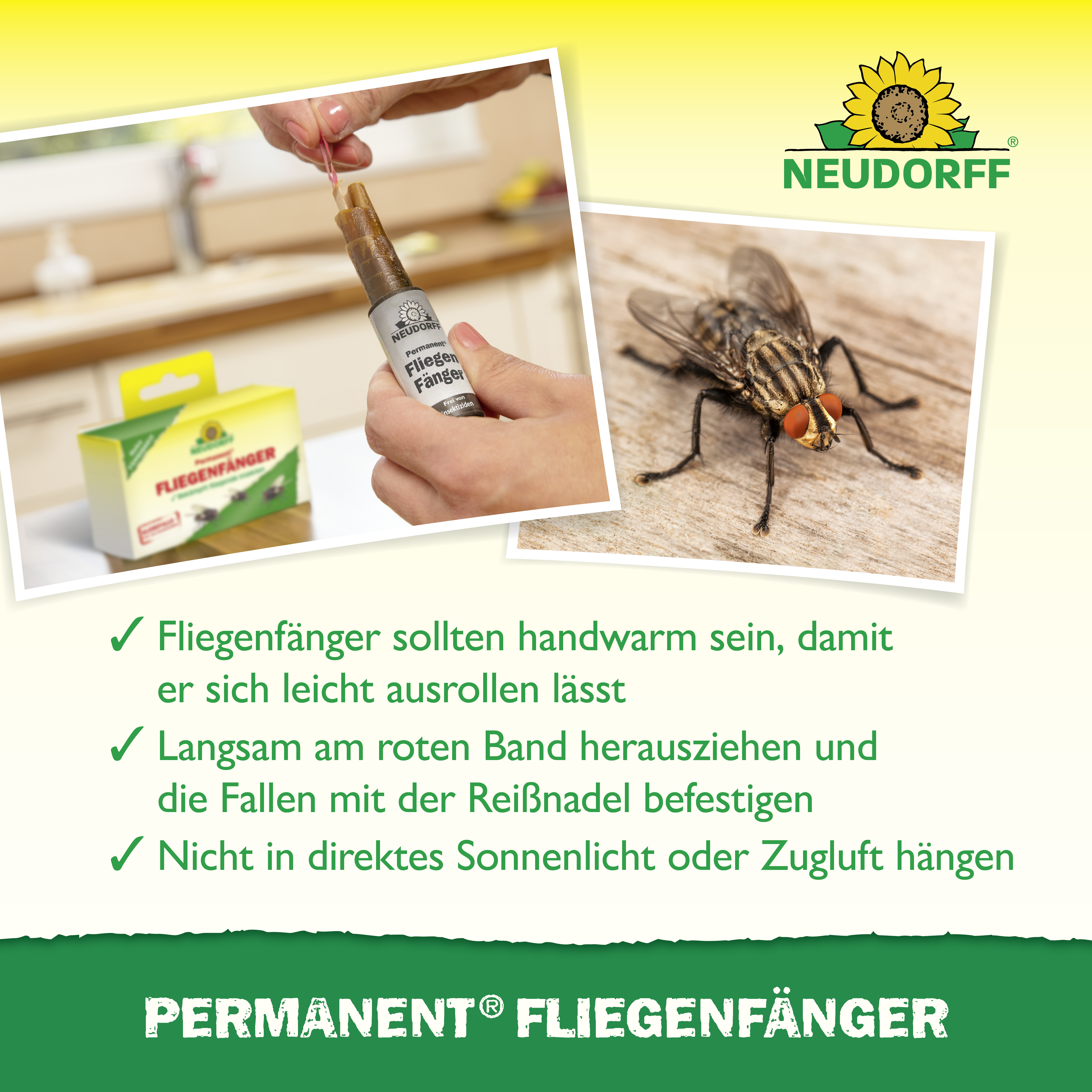 - Damit sich die FliegenFänger leicht ausrollen lassen, einige Zeit zwischen den Händen halten. (Die FliegenFänger sollten handwarm sein.)