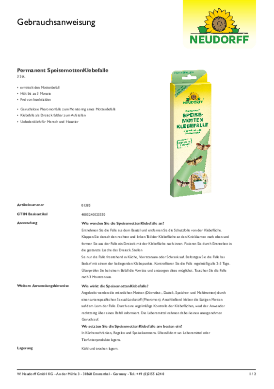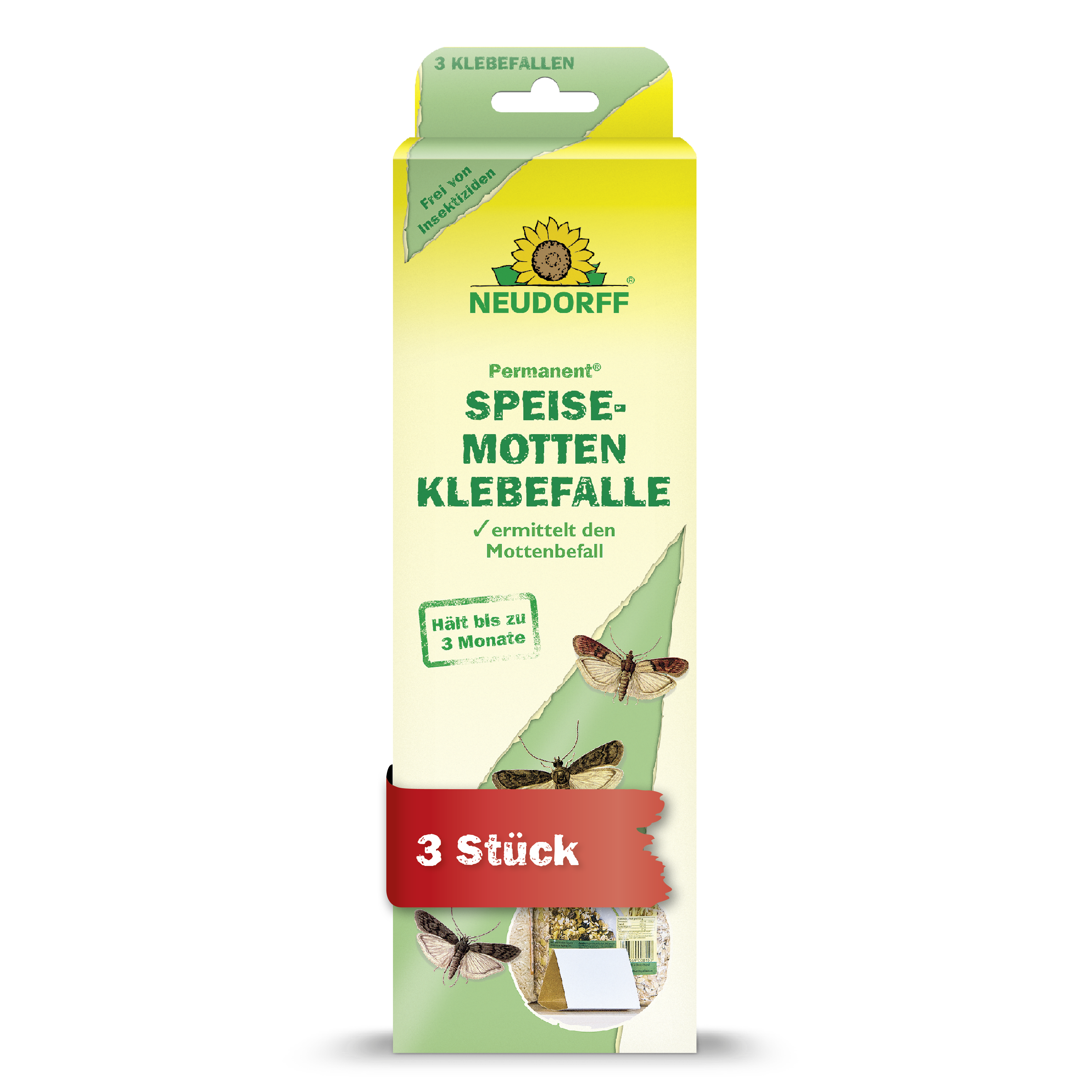 Sie nun die Falle freistehend in Küche, Vorratsraum oder Schrank auf. Befestigen Sie die Falle bei Bedarf mit einem der beiliegenden Klebepunkte. Kontrollieren Sie die Falle regelmäßig alle 2-3 Tage. Überprüfen Sie bei einem Befall die Vorräte und entsorgen diese möglichst. Tauschen Sie die Falle nach 3 Monaten aus.