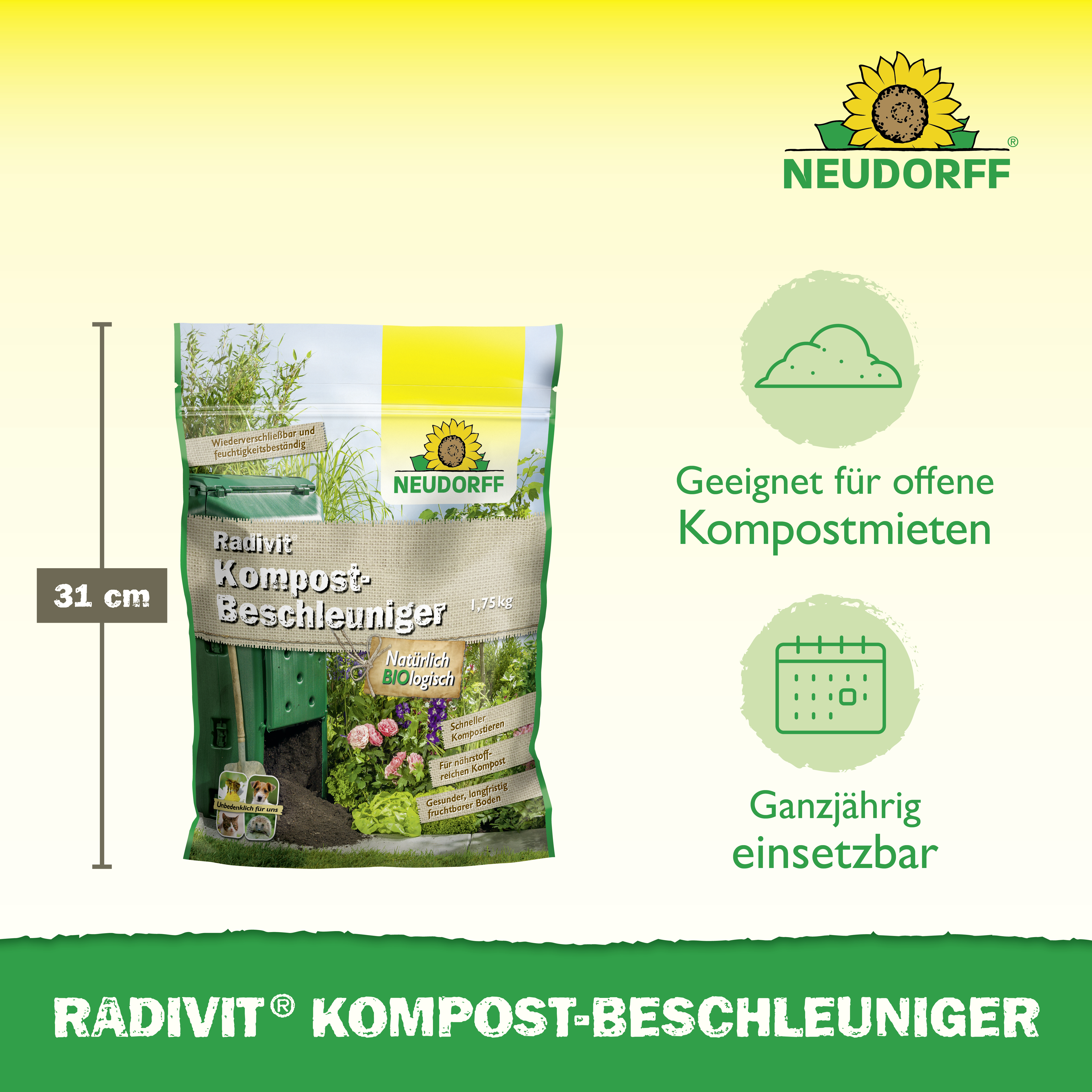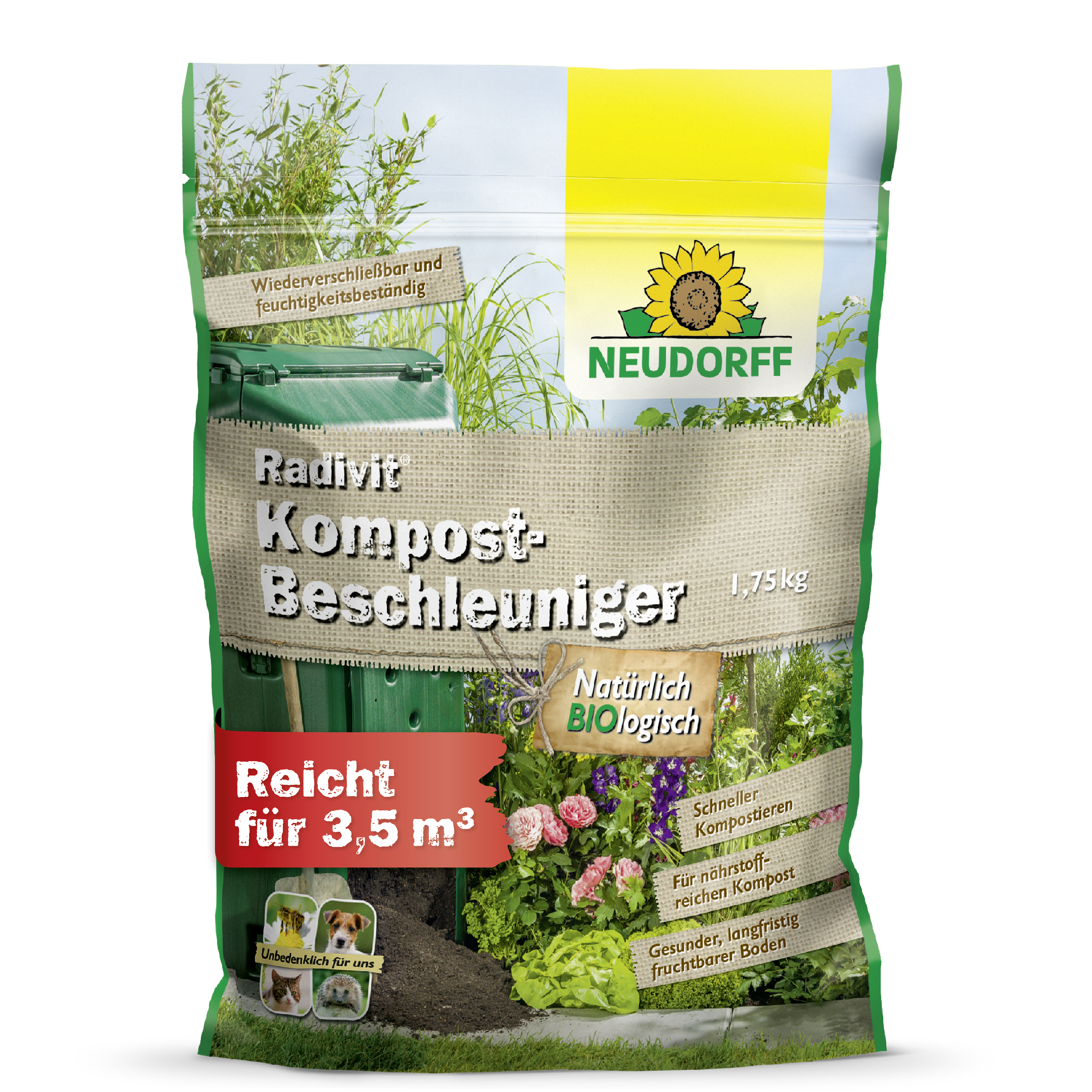 Anwendung: Auf jede frische Lage etwas 2 gehäufte Esslöffel Radivit Kompost-Beschleuniger streuen. Ist der Kompost zu nass, bindet eine Handvoll Bentonit SandbodenVerbesserer von Neudorff die überschüssige Feuchtigkeit.