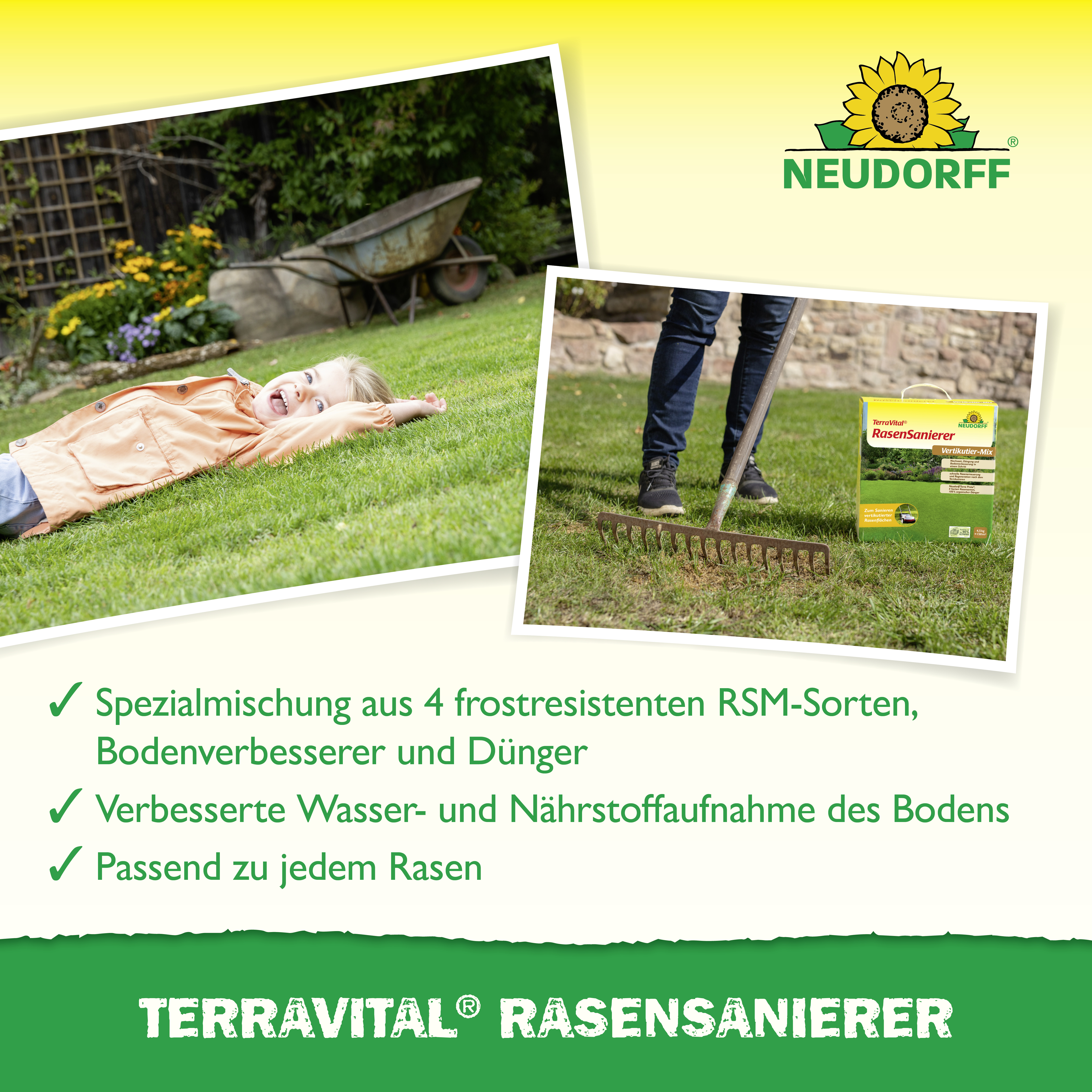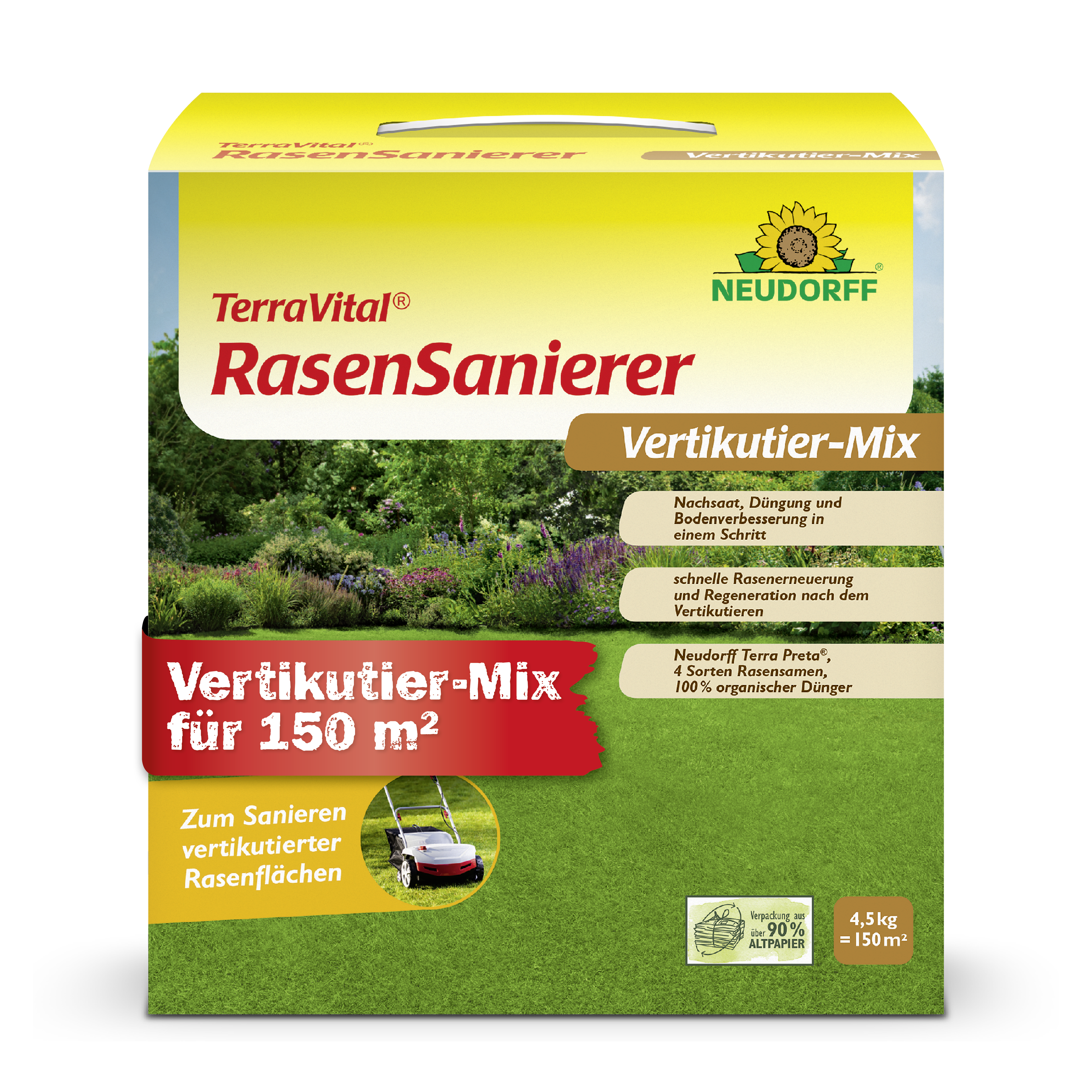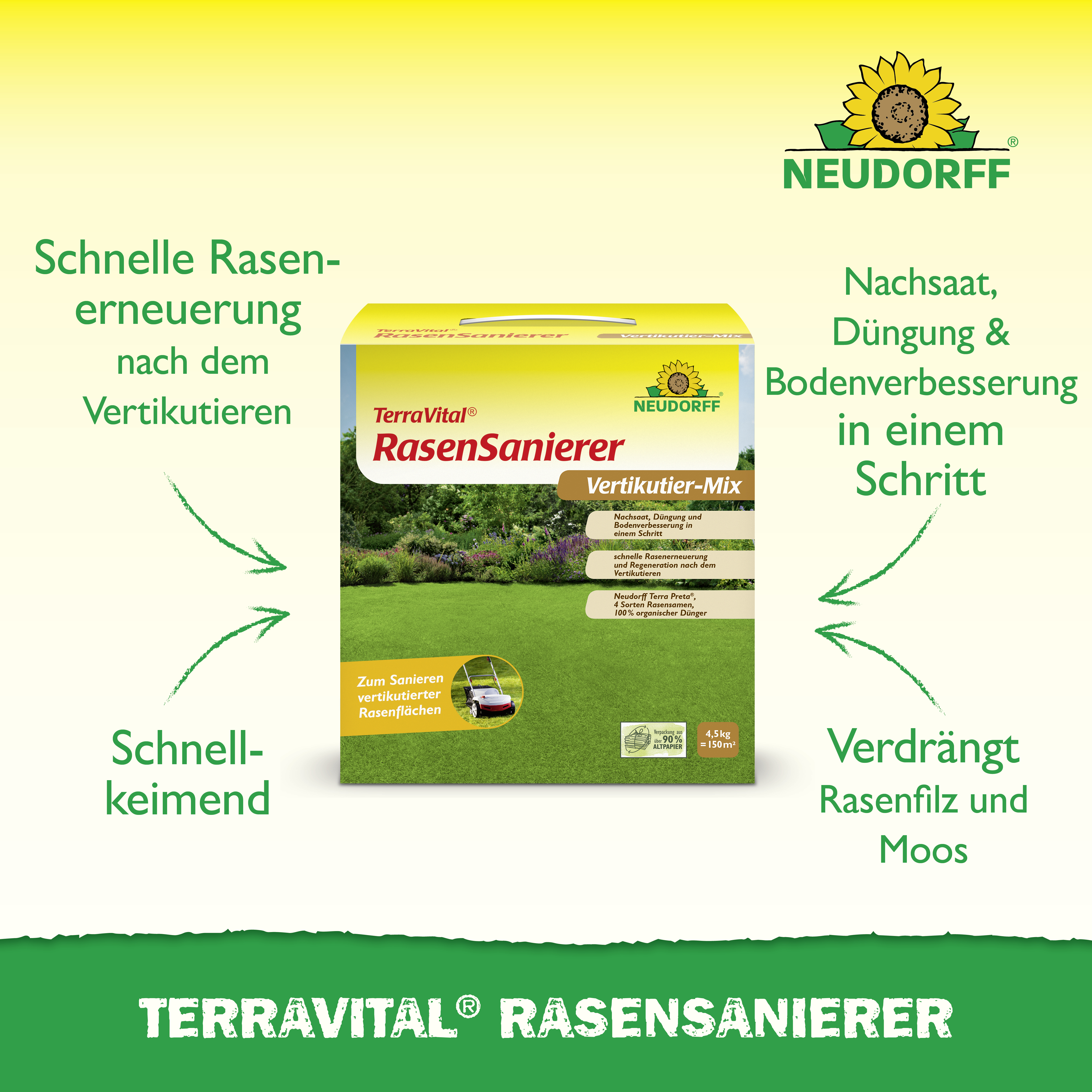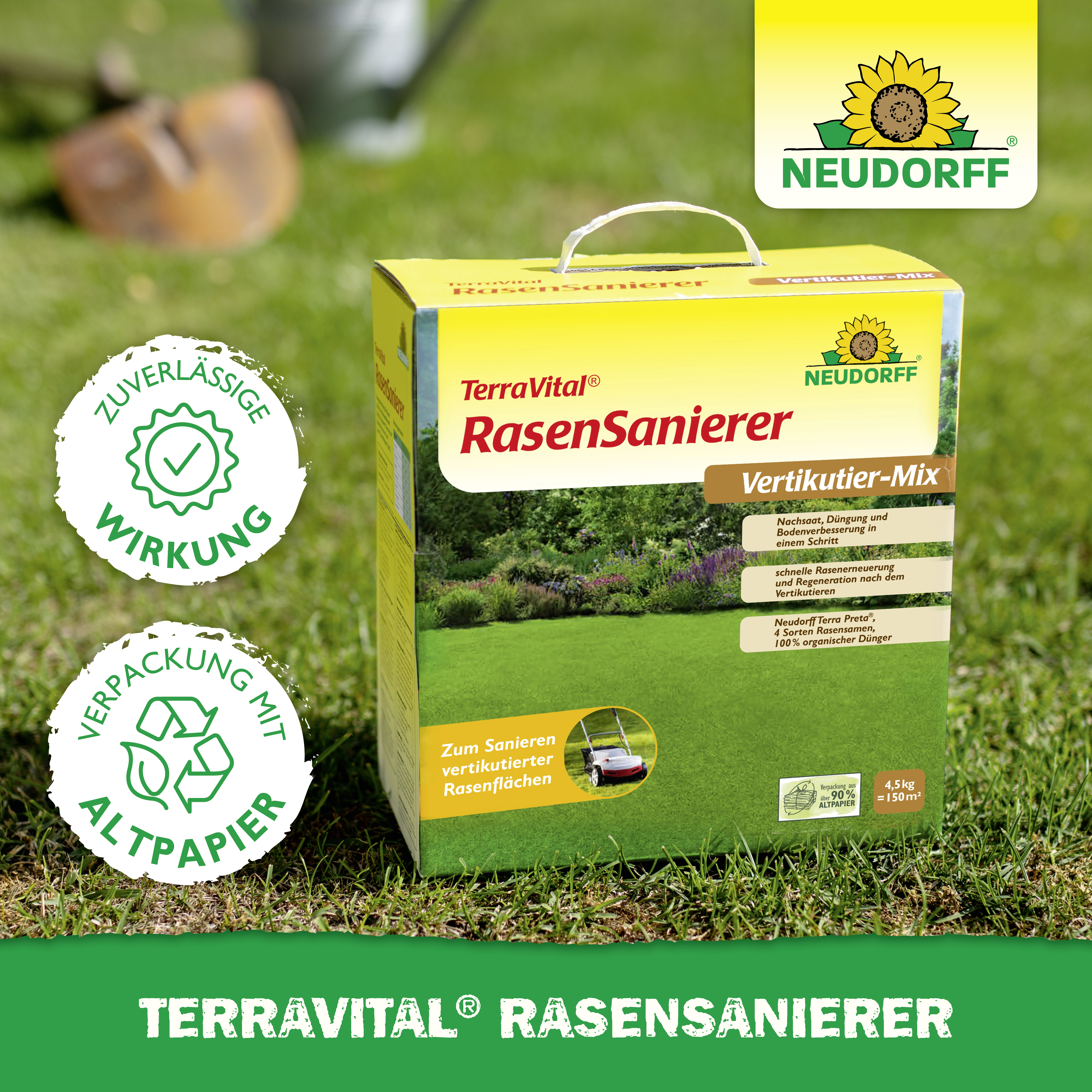 - anwendungsfertige Spezialmischung mit Rasensamen, Neudorff Terra Preta und 100% organischem Dünger