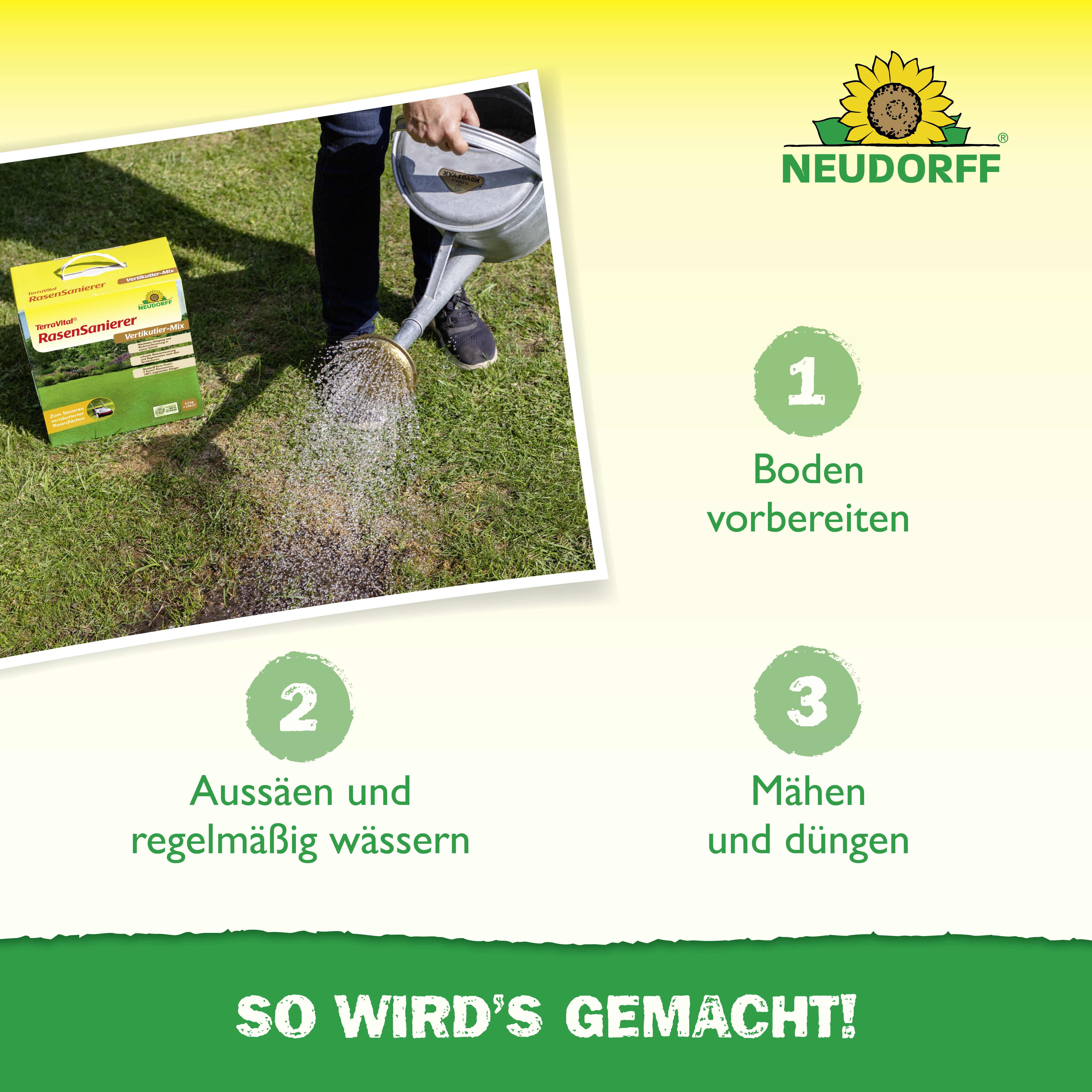- mischen Sie den Beutel mit TerraVital RasenSanierer vor dem Aussäen gut durch