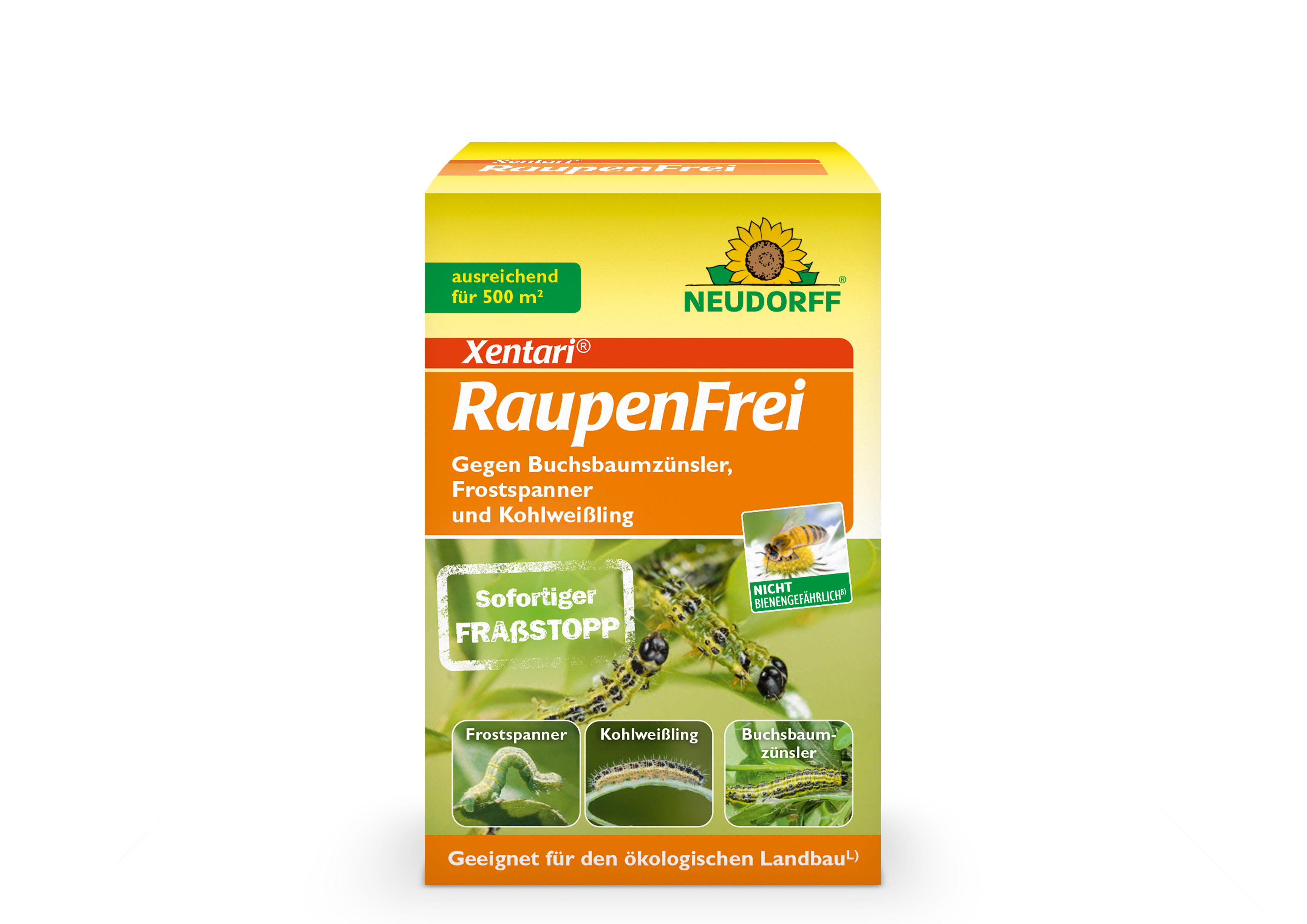 - bekämpft Buchsbaumzünsler, Frostspanner, Kohlweißlinge und Traubenwickler