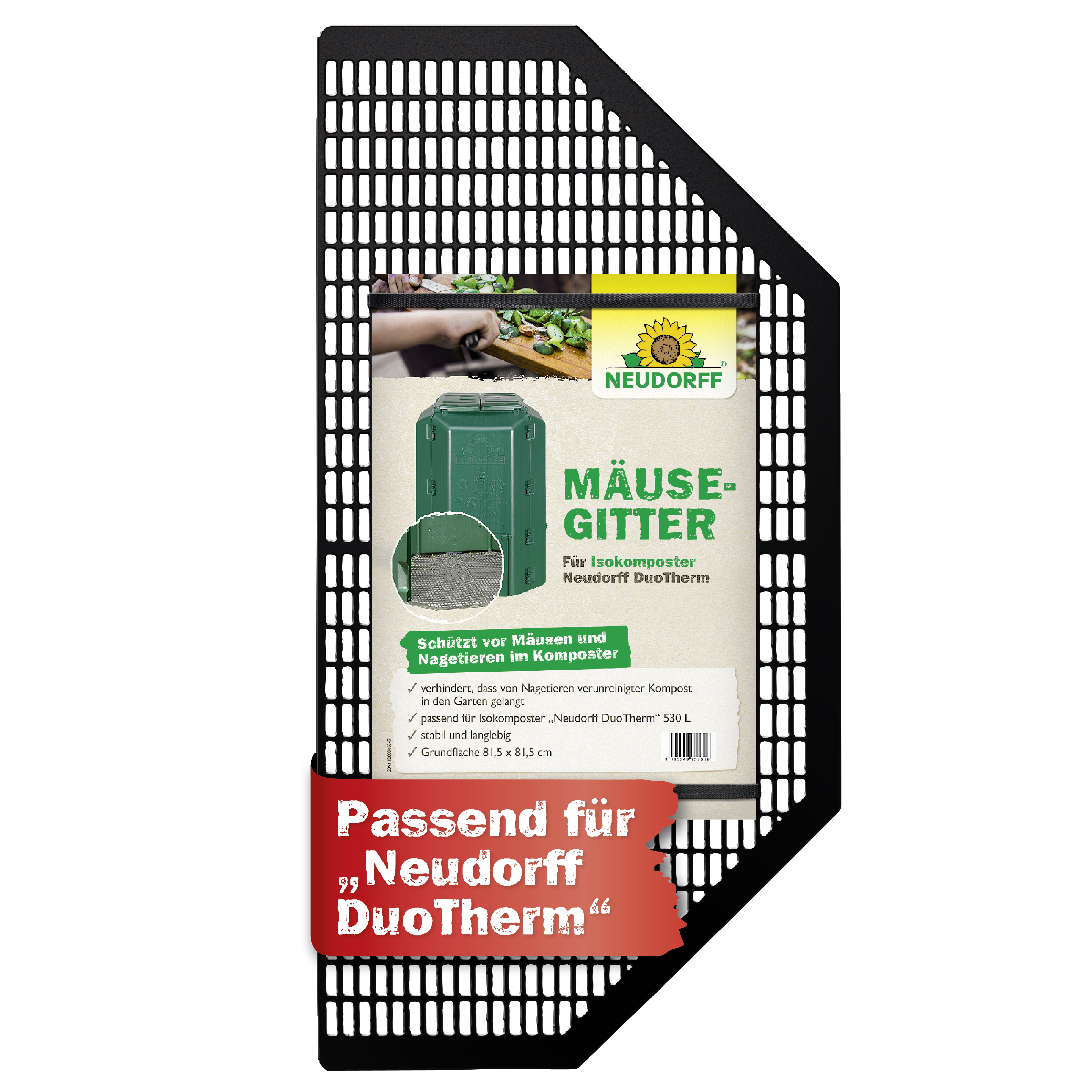 Der Thermokomposter „Neudorff DuoTherm“ 530 L braucht Kontakt mit dem Boden, damit natürliche Zersetzer des organischen Materials, wie Regenwürmer, Asseln und Mikroorganismen, im Komposter aufsteigen können. Aber auch Nagetiere finden so in das Silo. Verhindern Sie mit diesem Bodengitter den Zugang für Ratten und Mäuse.